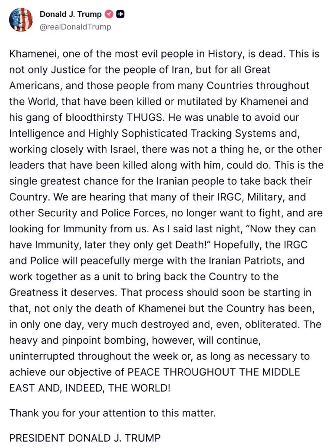 “Khamenei, one of the most evil people in History, is dead. This is not only Justice for the people of Iran, but for all Great Americans, and those people from many Countries throughout the World, that have been killed or mutilated by Khamenei and his gang of bloodthirsty THUGS. He was unable to avoid our Intelligence and Highly Sophisticated Tracking Systems and, working closely with Israel, there was not a thing he, or the other leaders that have been killed along with him, could do. This is the single greatest chance for the Iranian people to take back their Country. We are hearing that many of their IRGC, Military, and other Security and Police Forces, no longer want to fight, and are looking for Immunity from us. As I said last night, “Now they can have Immunity, later they only get Death!” Hopefully, the IRGC and Police will peacefully merge with the Iranian Patriots, and work together as a unit to bring back the Country to the Greatness it deserves. That process should soon be starting in that, not only the death of Khamenei but the Country has been, in only one day, very much destroyed and, even, obliterated. The heavy and pinpoint bombing, however, will continue, uninterrupted throughout the week or, as long as necessary to achieve our objective of PEACE THROUGHOUT THE MIDDLE EAST AND, INDEED, THE WORLD!