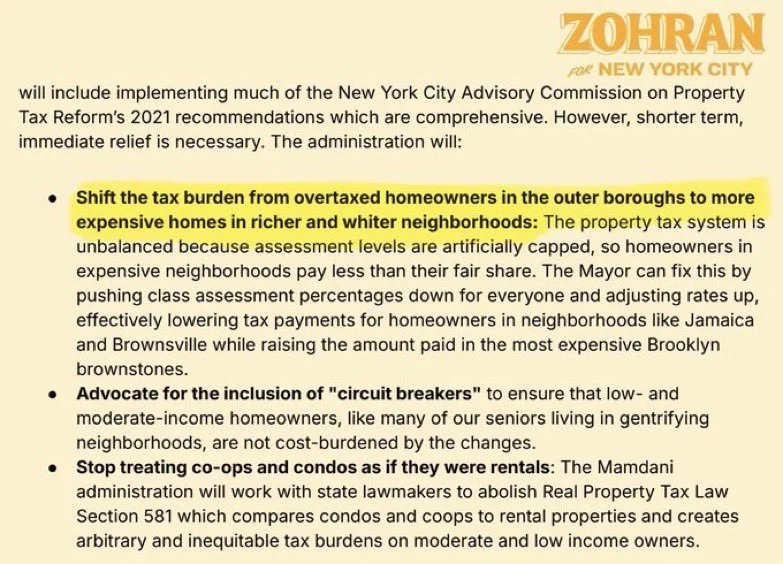 “Shift the tax burden from overtaxed homeowners in the outer boroughs to more expensive homes in richer and whiter neighborhoods: The property tax system is unbalanced because assessment levels are artificially capped, so homeowners in expensive neighborhoods pay less than their fair share. The Mayor can fix this by pushing class assessment percentages down for everyone and adjusting rates up, effectively lowering tax payments for homeowners in neighborhoods like Jamaica and Brownsville while raising the amount paid in the most expensive Brooklyn brownstones.”
